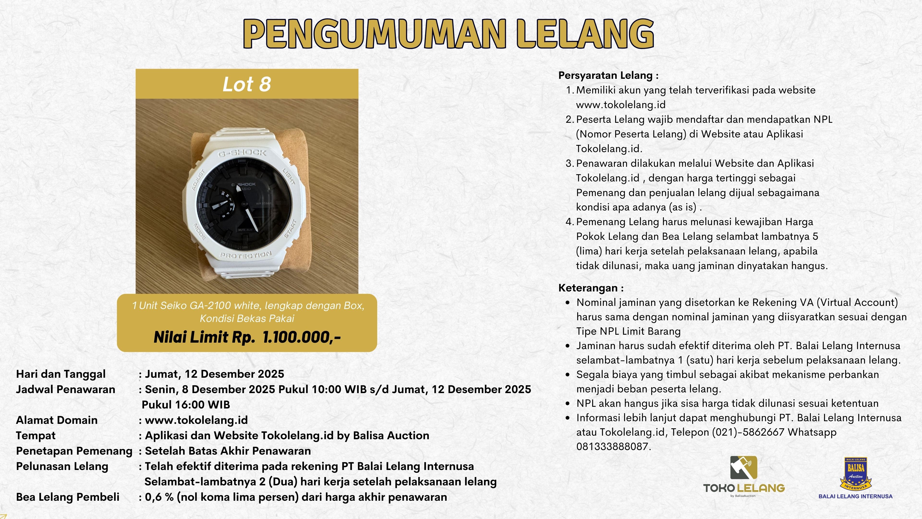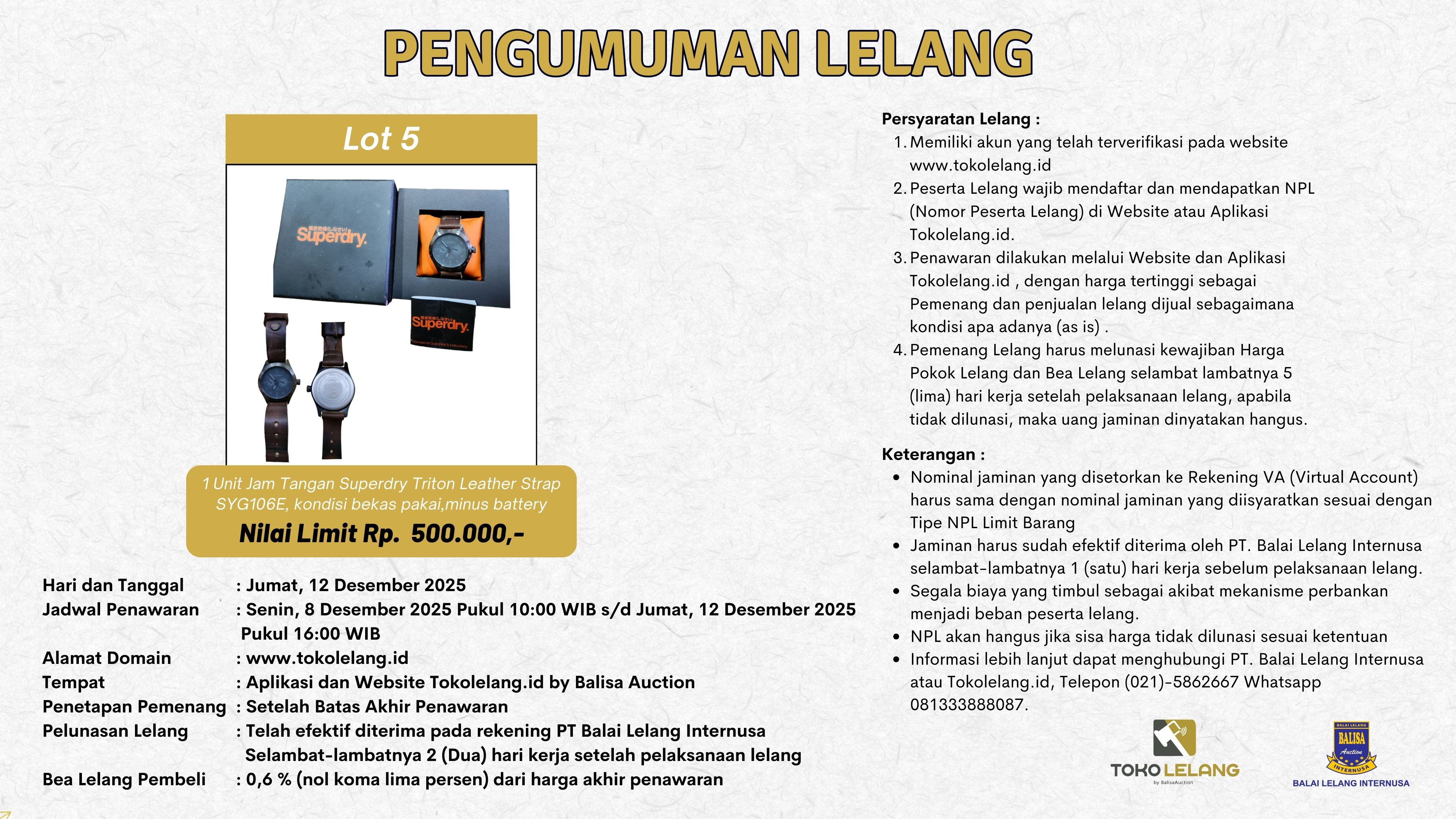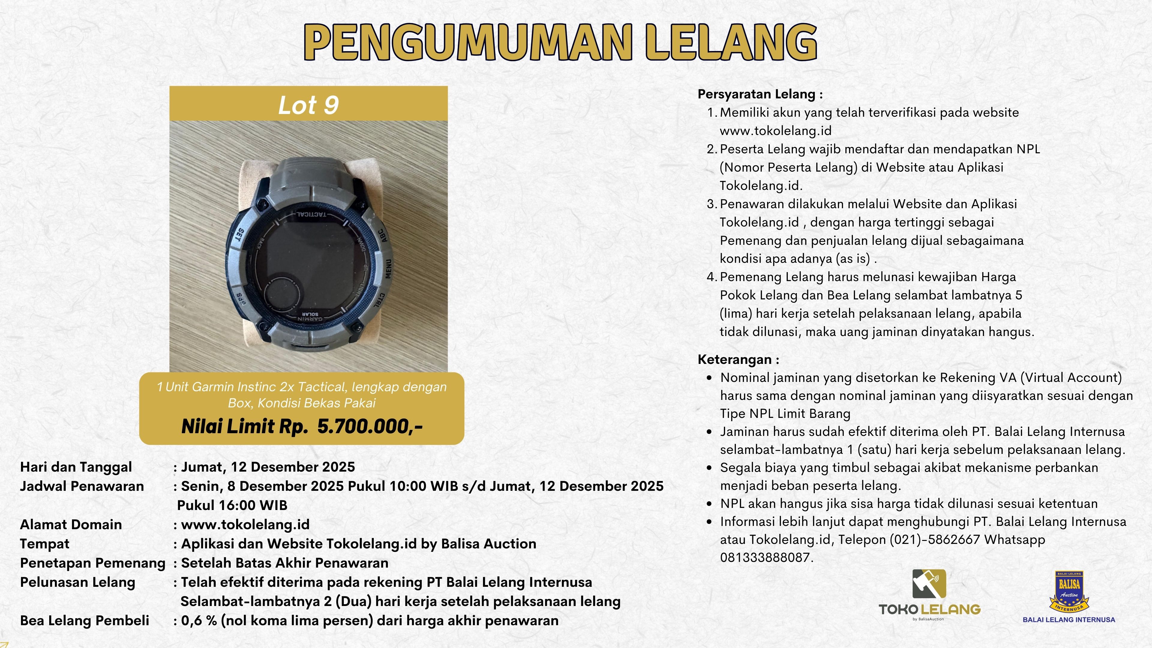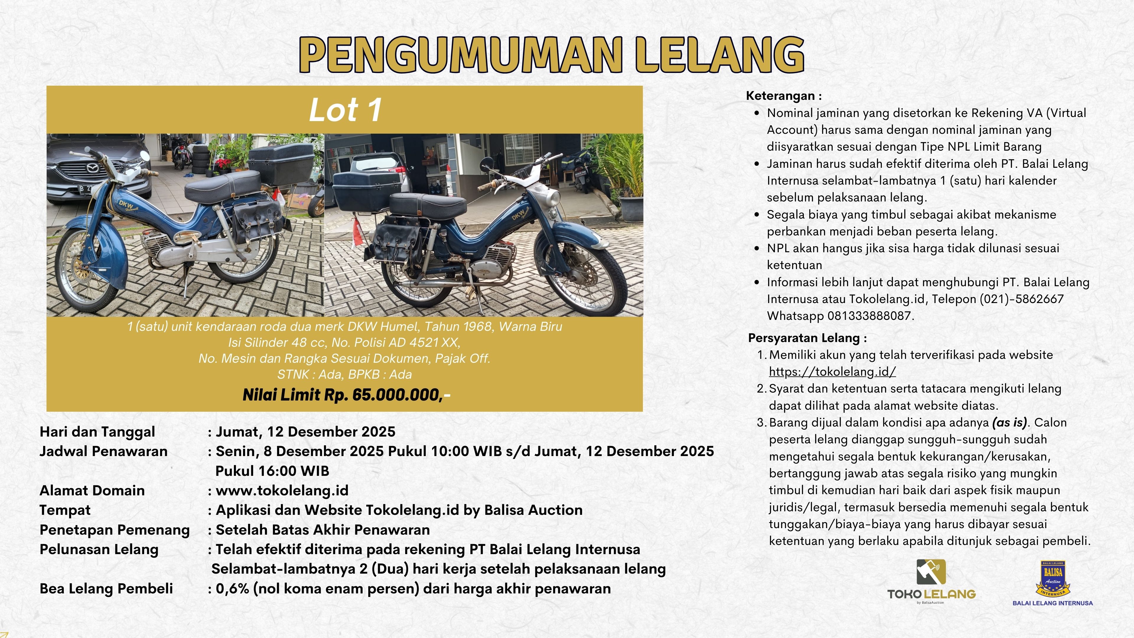 Mohon berhati-hati. Lakukan lelang dan pembayaran hanya melalui website, aplikasi, dan rekening resmi Balai Lelang Internusa, atau dapat menghubungi 021-5862667.