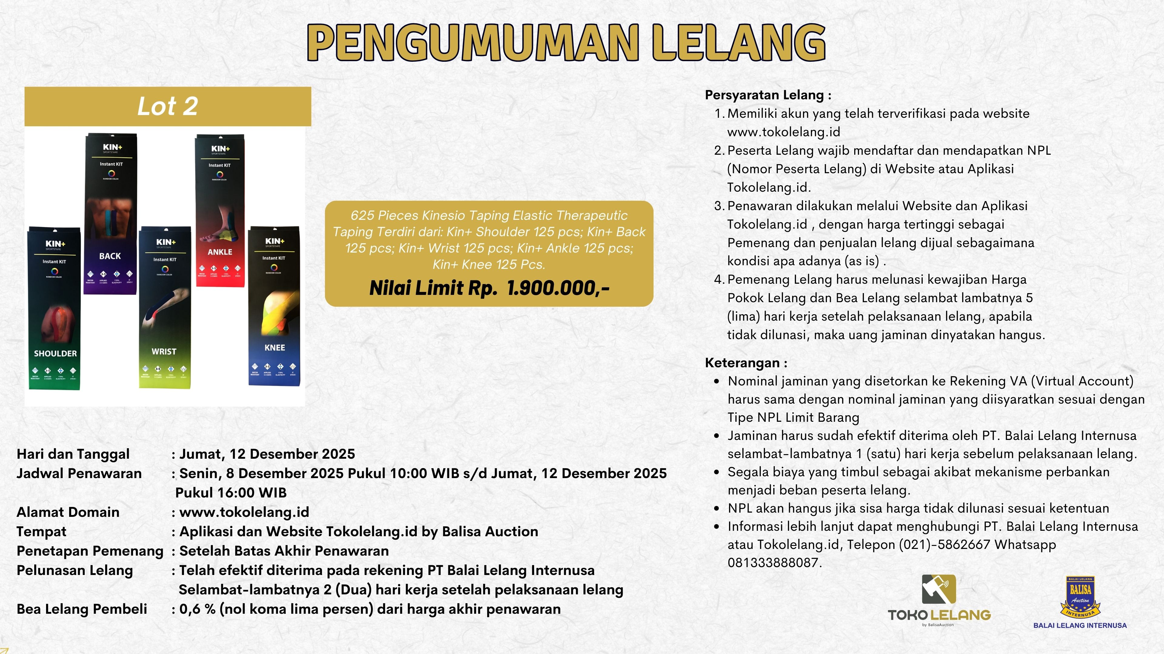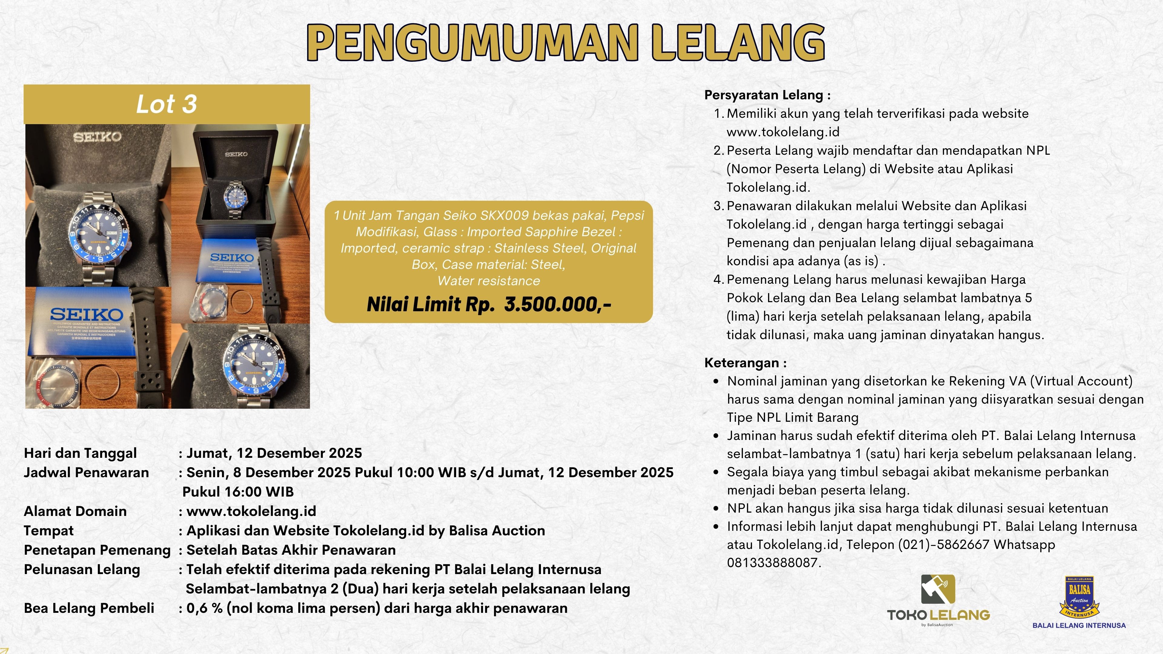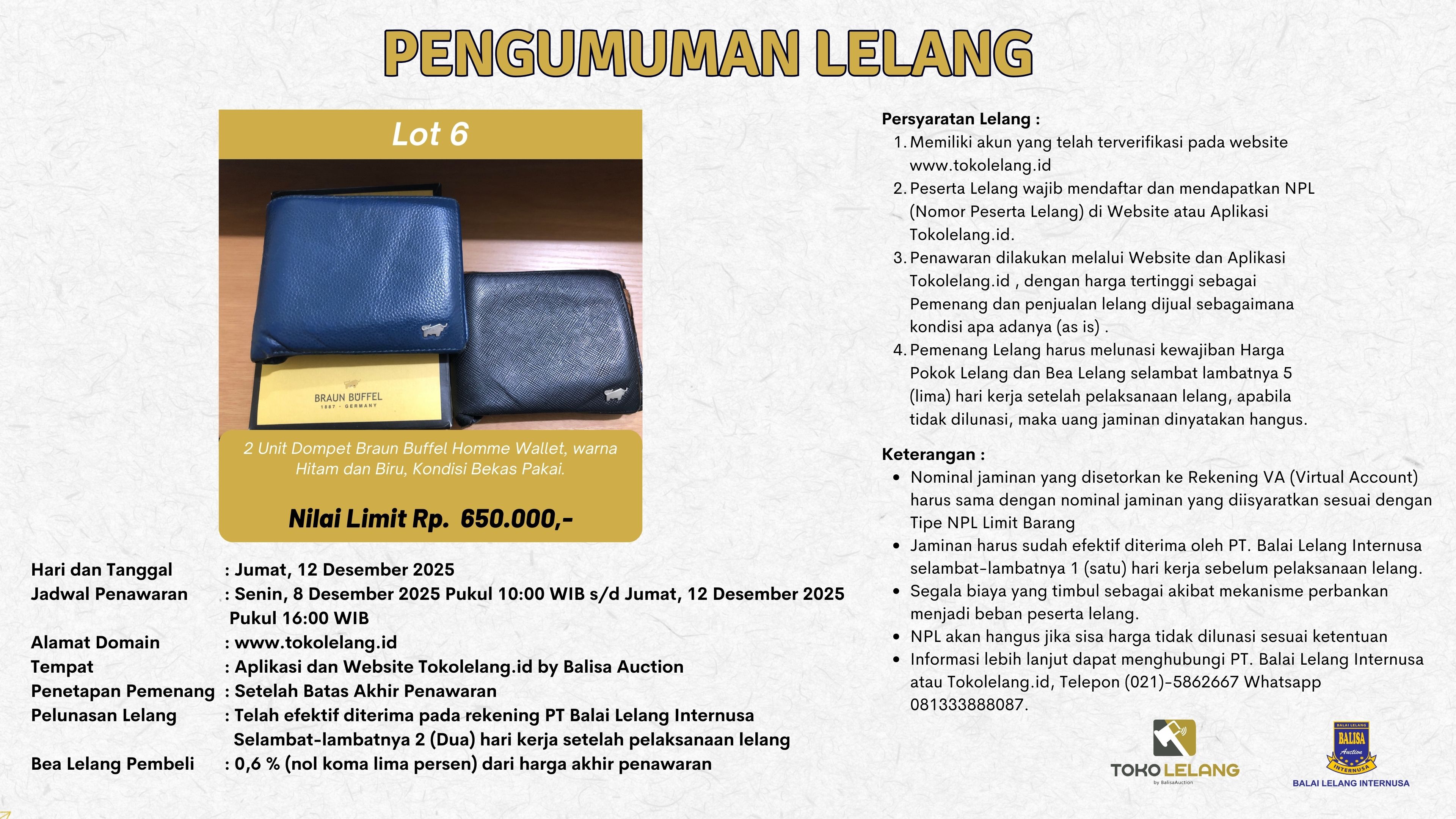 Mohon berhati-hati. Lakukan lelang dan pembayaran hanya melalui website, aplikasi, dan rekening resmi Balai Lelang Internusa, atau dapat menghubungi 021-5862667.