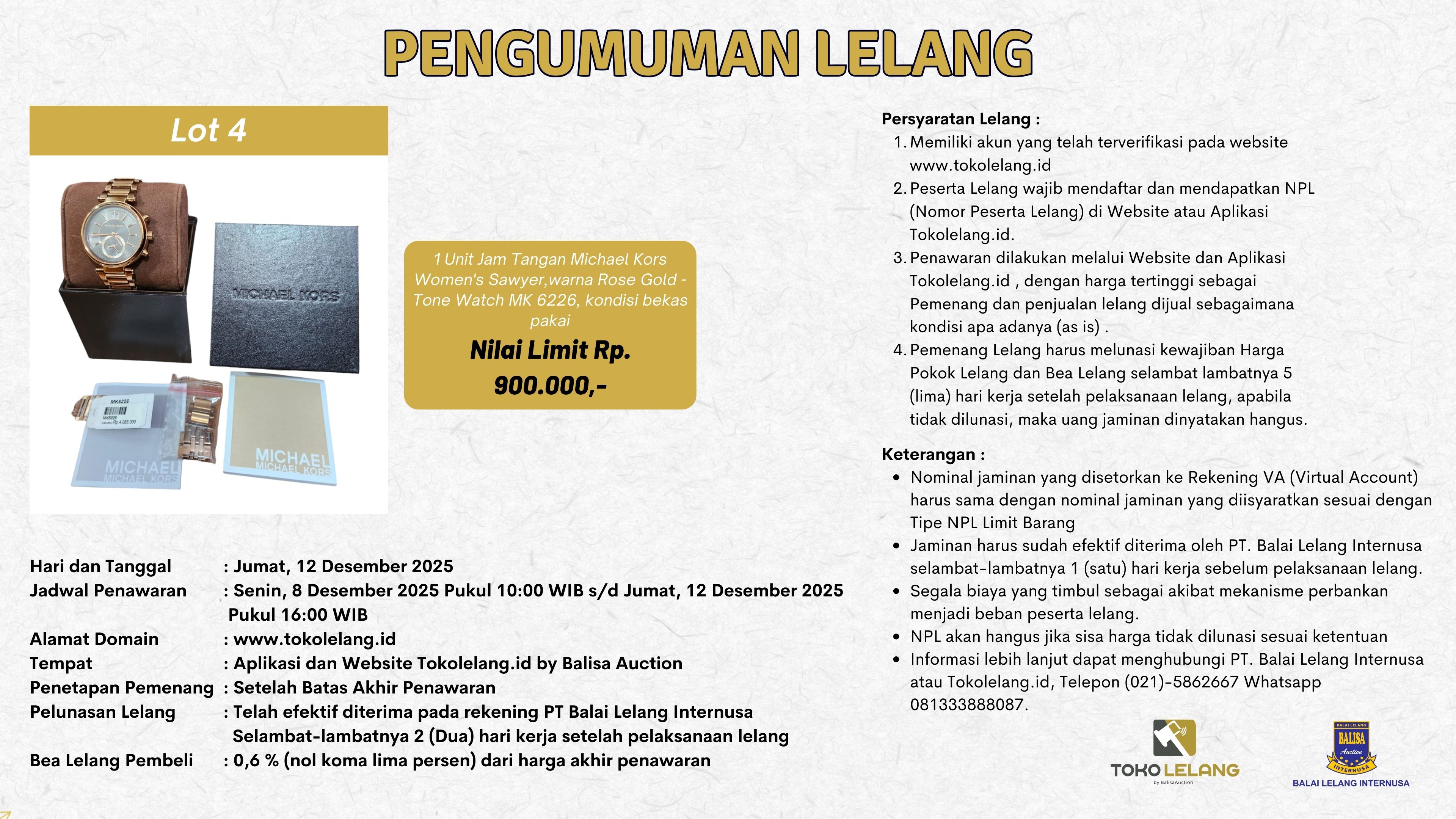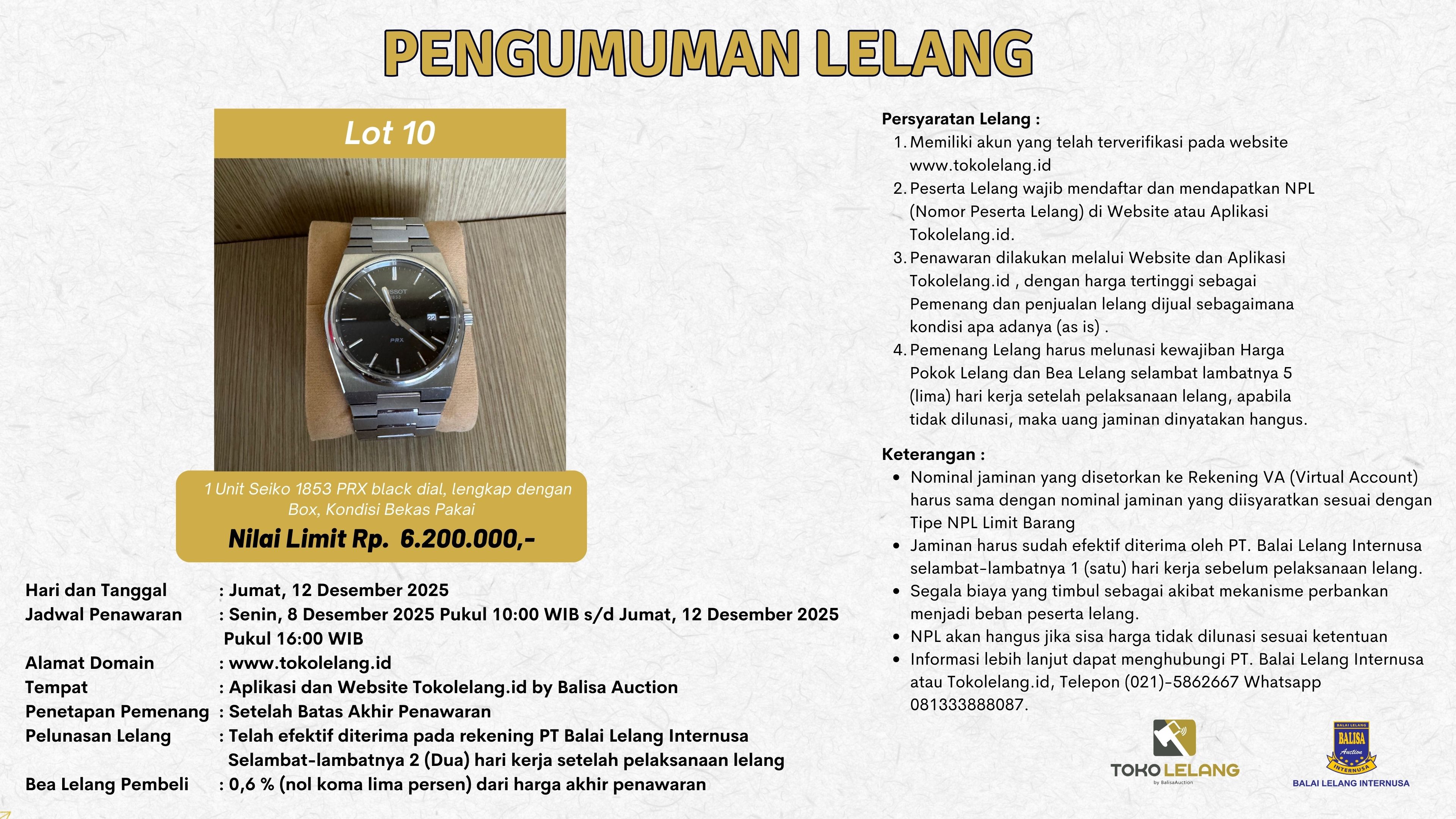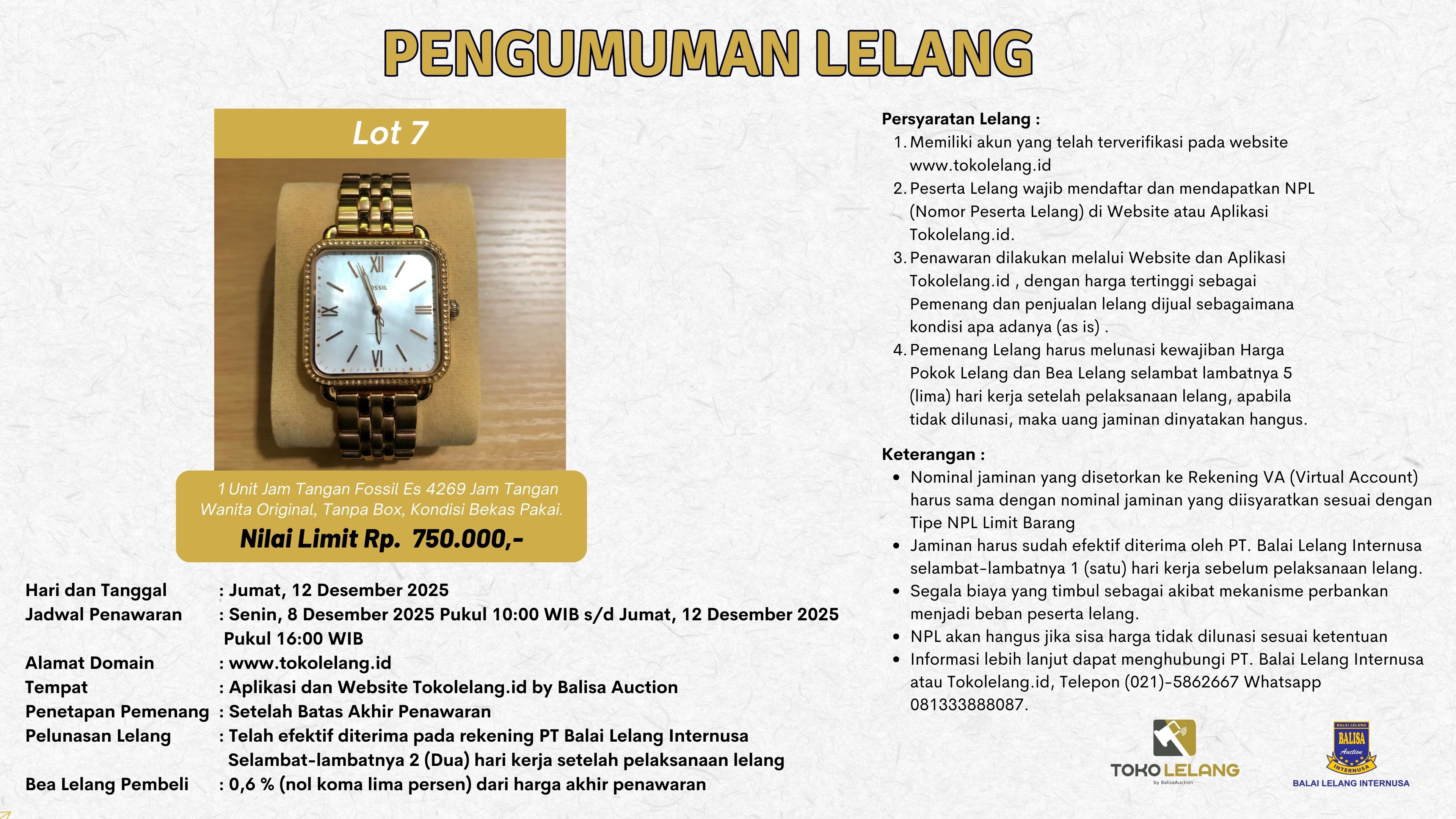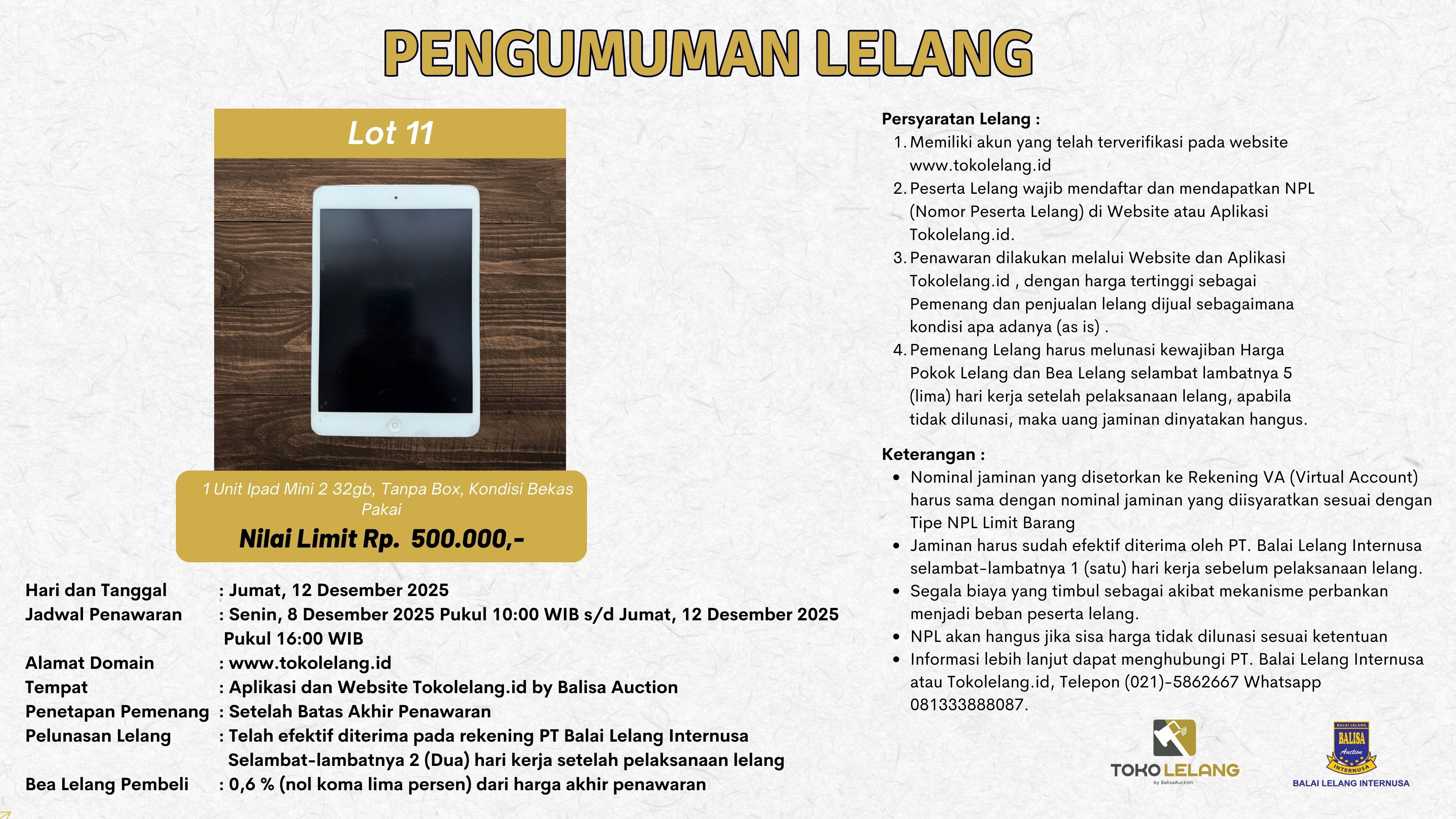 Mohon berhati-hati. Lakukan lelang dan pembayaran hanya melalui website, aplikasi, dan rekening resmi Balai Lelang Internusa, atau dapat menghubungi 021-5862667.