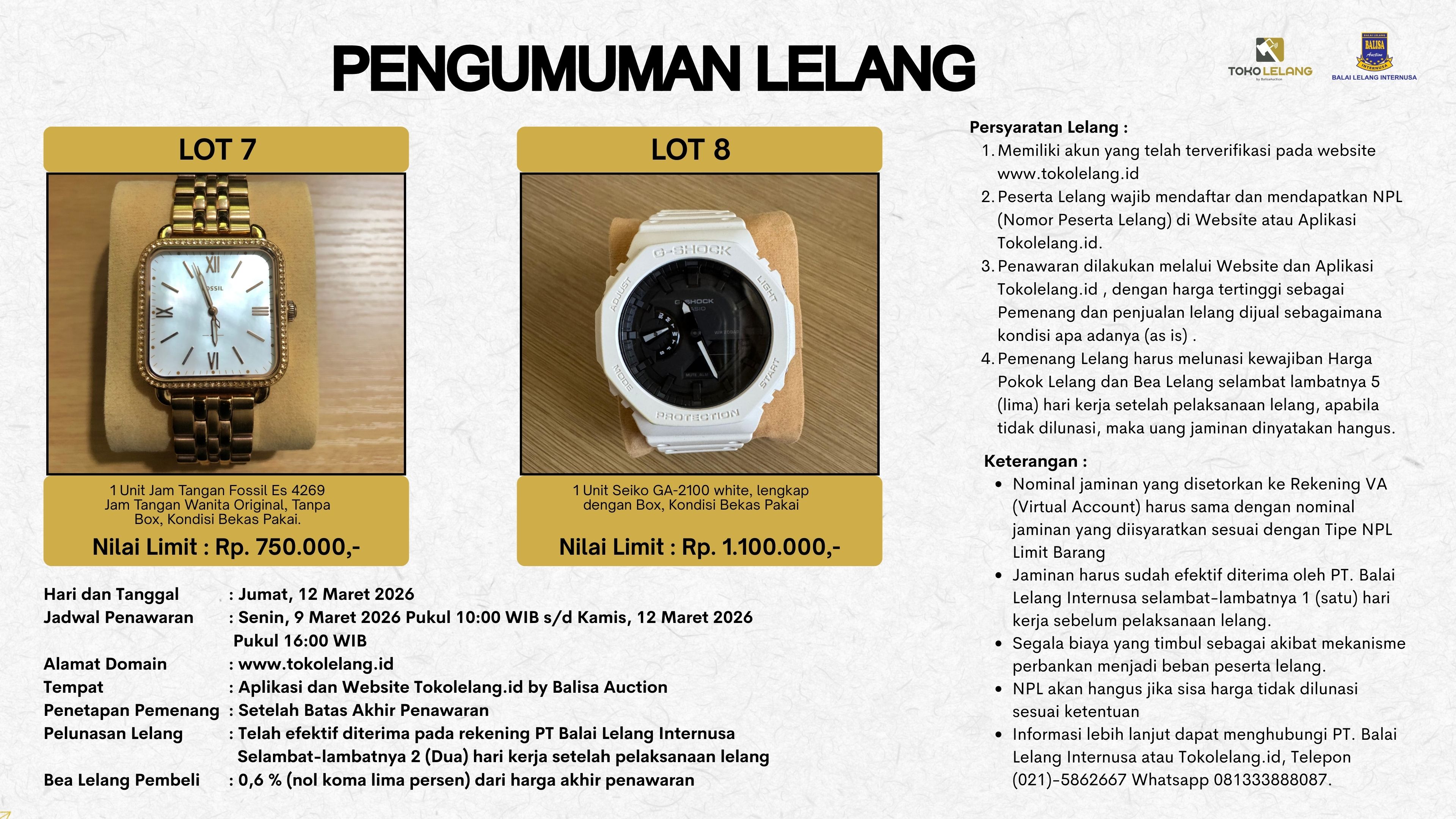 Mohon berhati-hati. Lakukan lelang dan pembayaran hanya melalui website, aplikasi, dan rekening resmi Balai Lelang Internusa, atau dapat menghubungi 021-5862667.